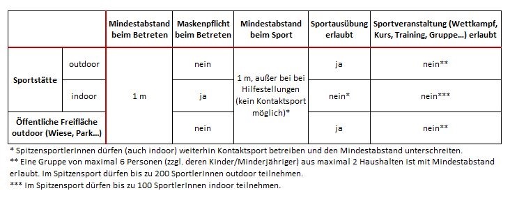 Kurz-Zusammenfassung der neuen Sport- und Sportveranstaltungs-Bestimmungen der COVID-19-Schutzmaßnahmen-Verordnung mit Gültigkeit seit 3. November 2020: